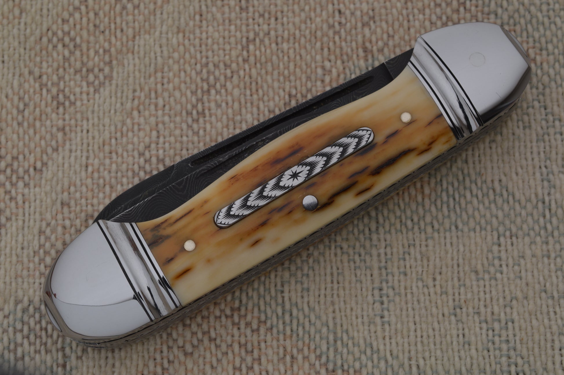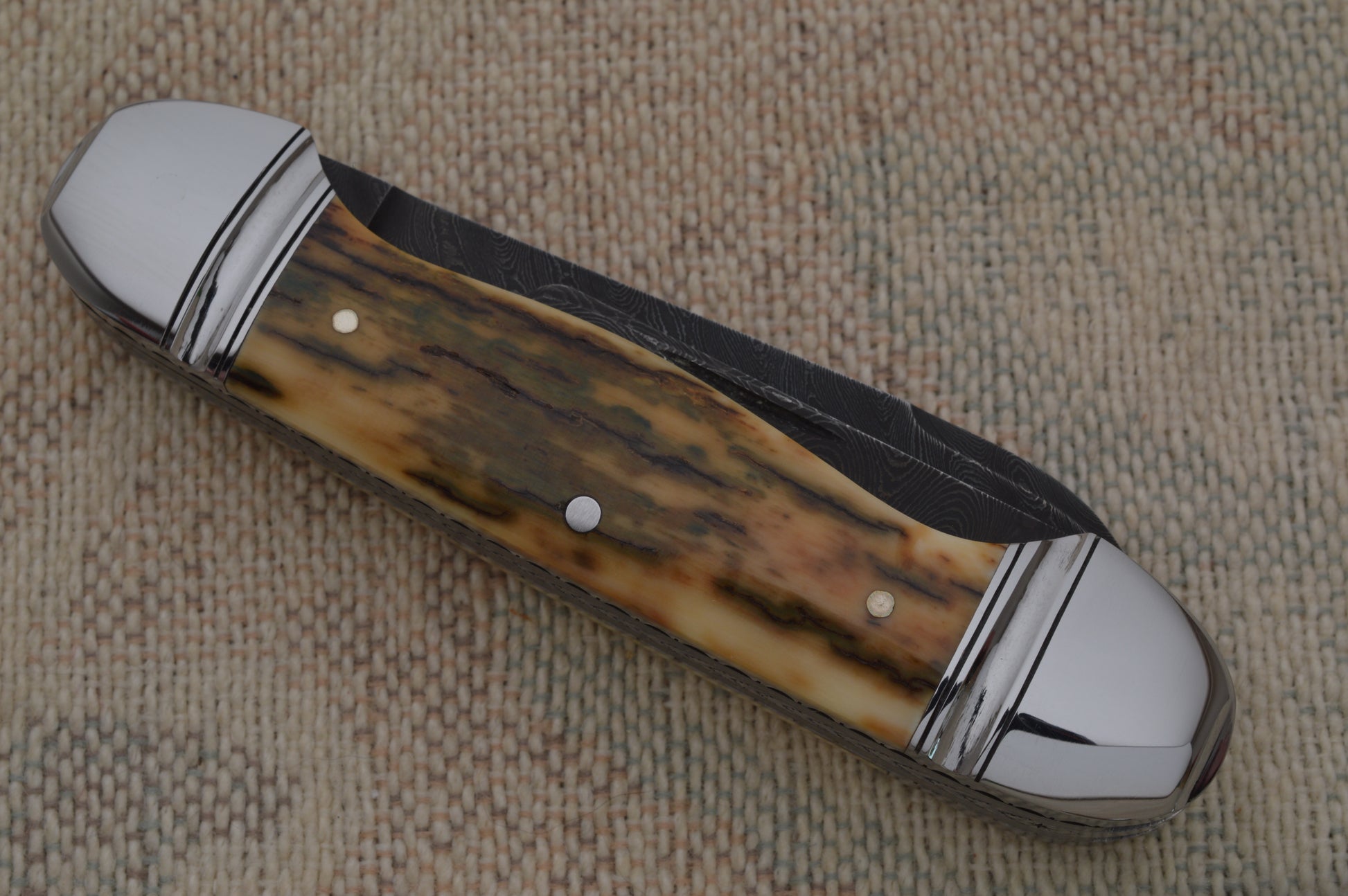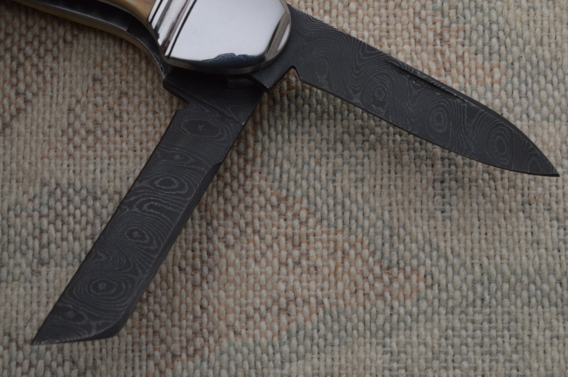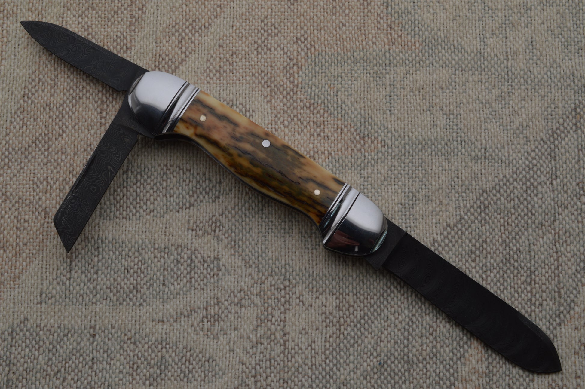 Bill Ruple Damascus Split-Back 3-Blade Canoe Whittler, Fossilized Scales