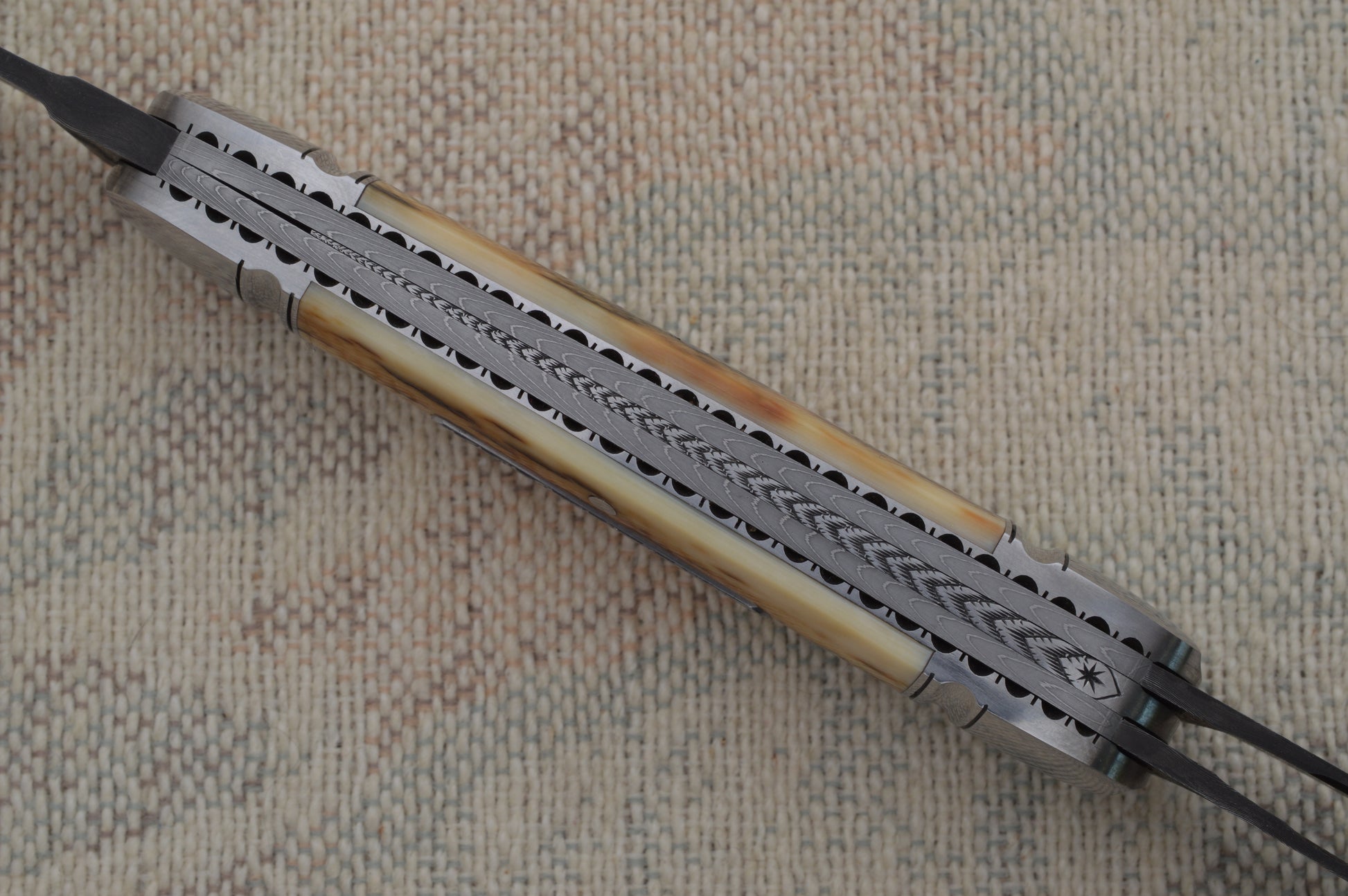 This 3-blade Split-Back Canoe Whittler is one of the more challenging builds that Bill makes, and this one has it all! All the blades are dark etched Damascus. The main blade is a Spearpoint grind, and the other two are Pen and Sheepsfoot blades. The design, and the way they fit together requires amazingly tight tolerances. And it is perfect in every way! Each blade has a half-stop, and features Bill's signature walk-and-talk. The front and rear bolsters are 416 stainless steel and are fluted where they meet the scales, as well as the rounded end. The fluting near the scales also has shadow pattern lines above and below. The liners are integral to the bolsters and are file-worked. The 416 SS shield is a beautifully engraved long bar. And there is matching engraving on the center of the backspring. Lastly, the handle scales are two beautiful pieces of fossilized material, with nice color and grains. All the blades lock up tight with no play, and the blade seating is nearly center. Nice comfortable long pull on the main blade and nail nicks on the other blades, with firm yet easy pulls. One previous owner and in excellent condition. Comes in a Ruple padded, zippered case.