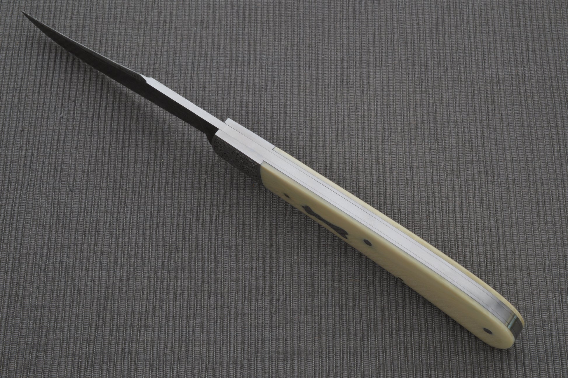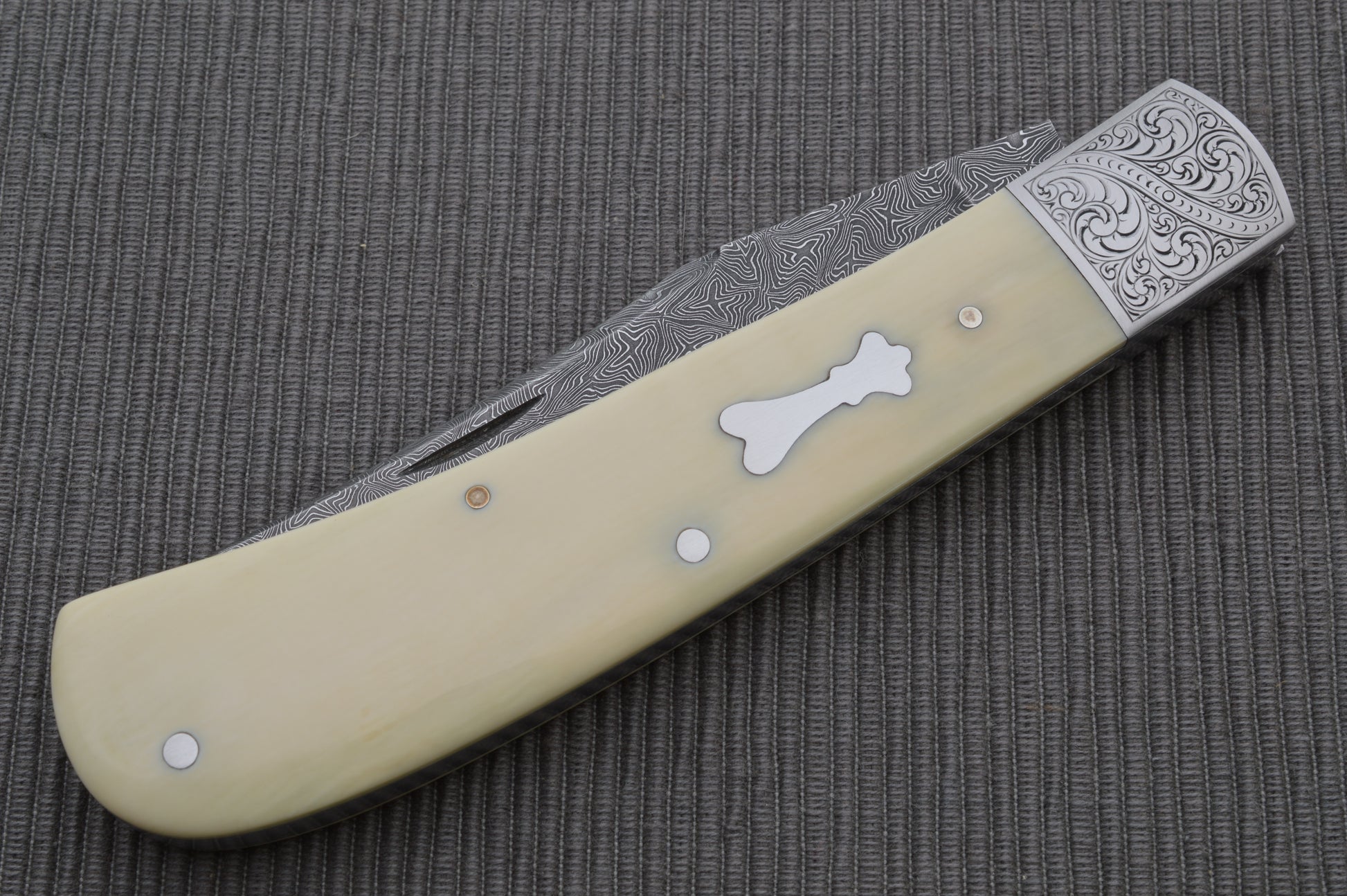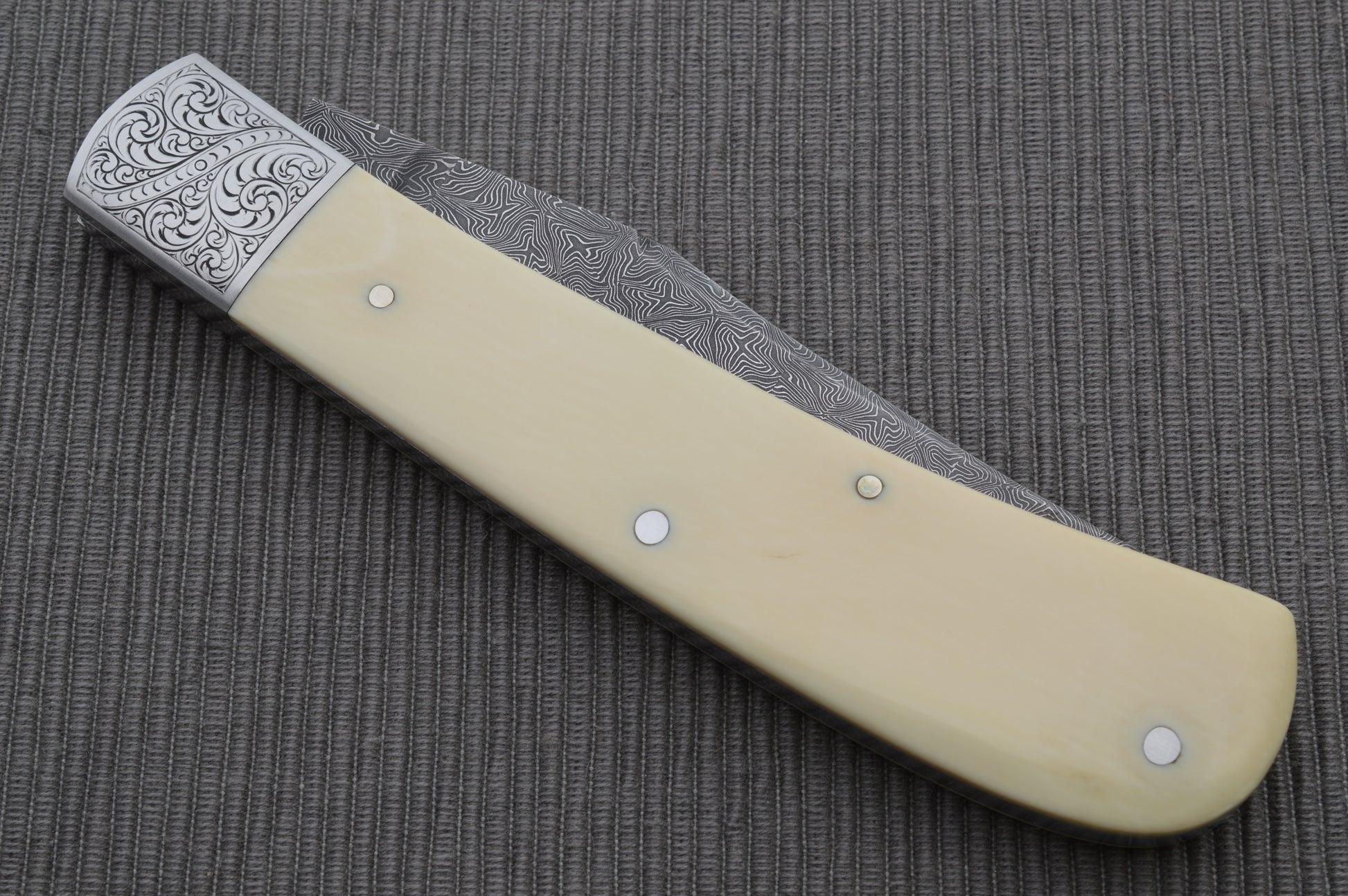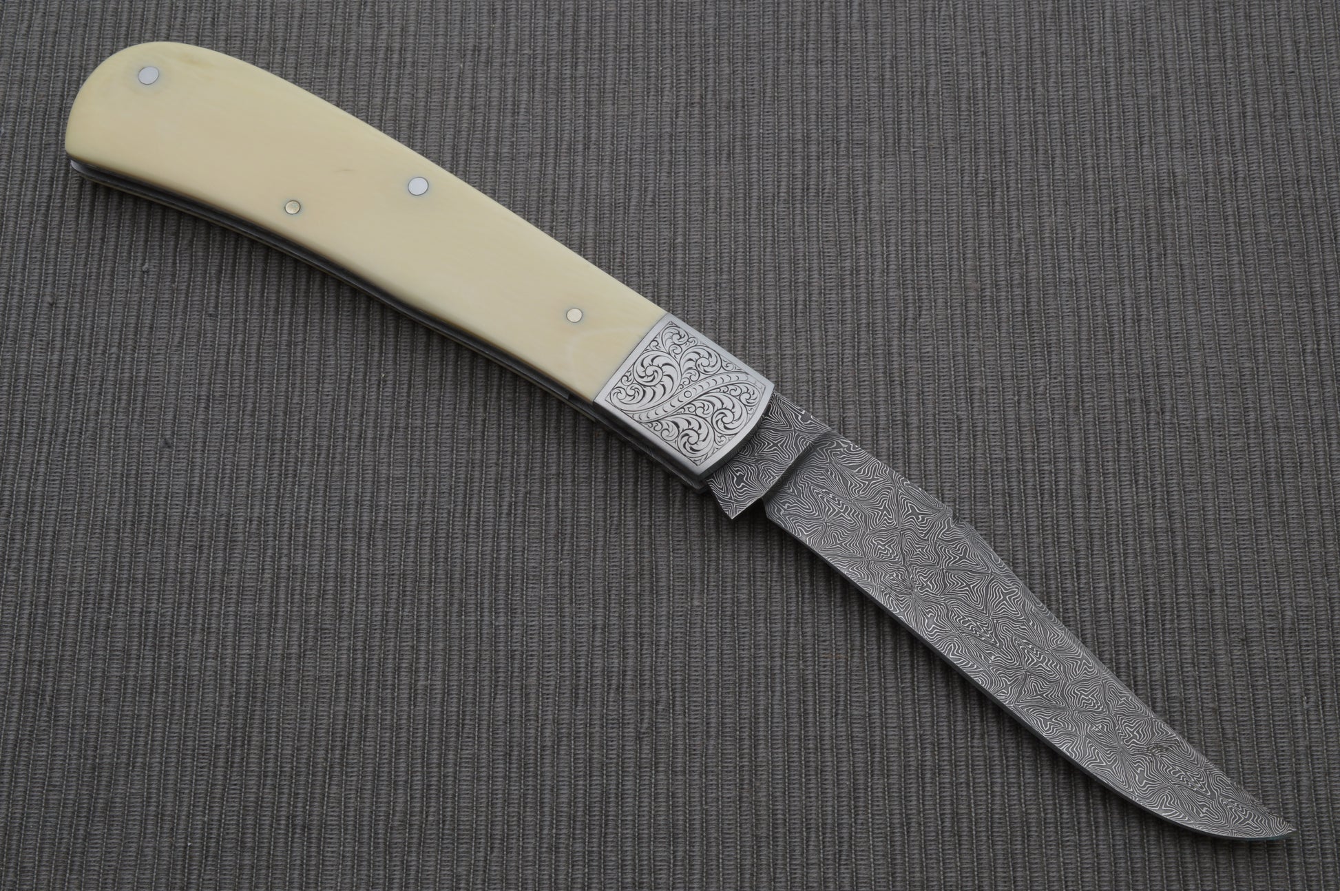 Steve Dunn M.S. Damascus Engraved Goat Horn Trapper, Slip-Joint Folding Knife
