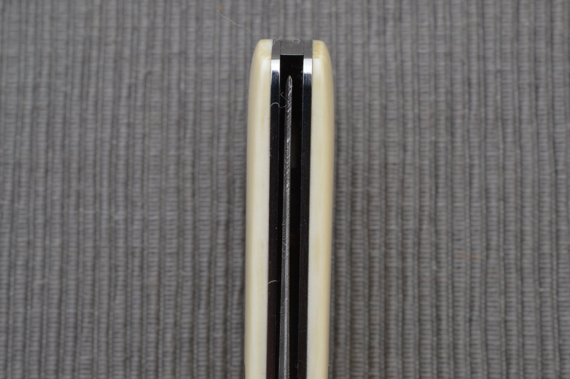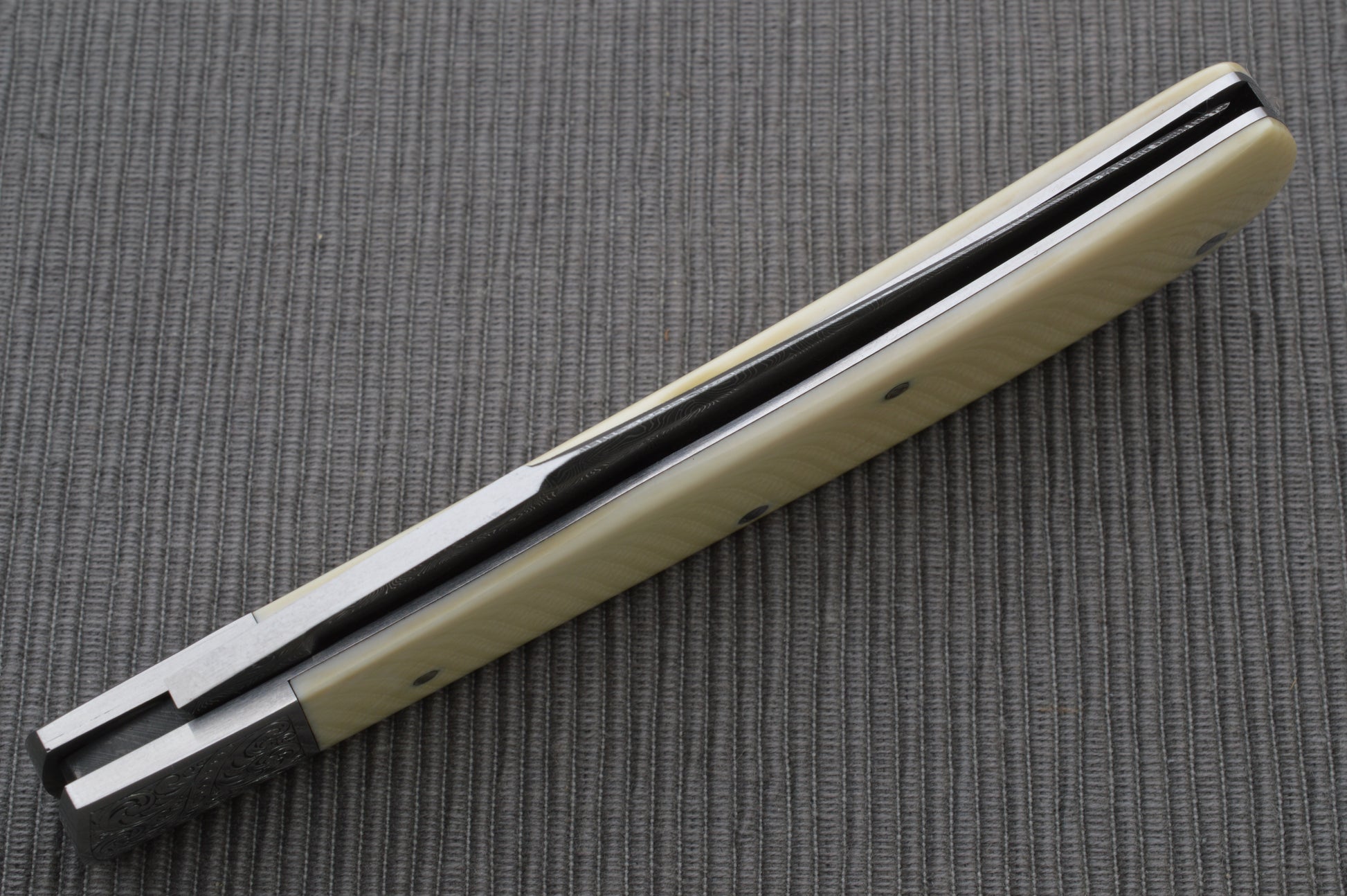 This Steve Dunn Large Trapper features a clip-point Damascus blade and two creamy African Goat Horn scales held by 4 stainless steel pins. Steve has expertly engraved a scrolled pattern on both sides of the bolster. The stainless-steel liners are integral to the bolster, and there is a stainless Keyhole shield on the show side. Although Steve was known for forged blades and his own Damascus, Steve was creating some of the most outstanding folding knives we've seen. His instructor - none other than Bill Ruple. And Steve’s fit and finish, and attention to detail are outstanding. Steve stamped DUNN on the ricasso of the blade. The blade has a smooth nail nick pull, half-stop, locks up tight with no play whatsoever, and the blade is centered between the liners when closed. Nice walk and talk from the Mastersmith! A rare opportunity to own an outstanding piece from a legendary knifemaker. Excellent condition. Comes in a padded, zippered case.