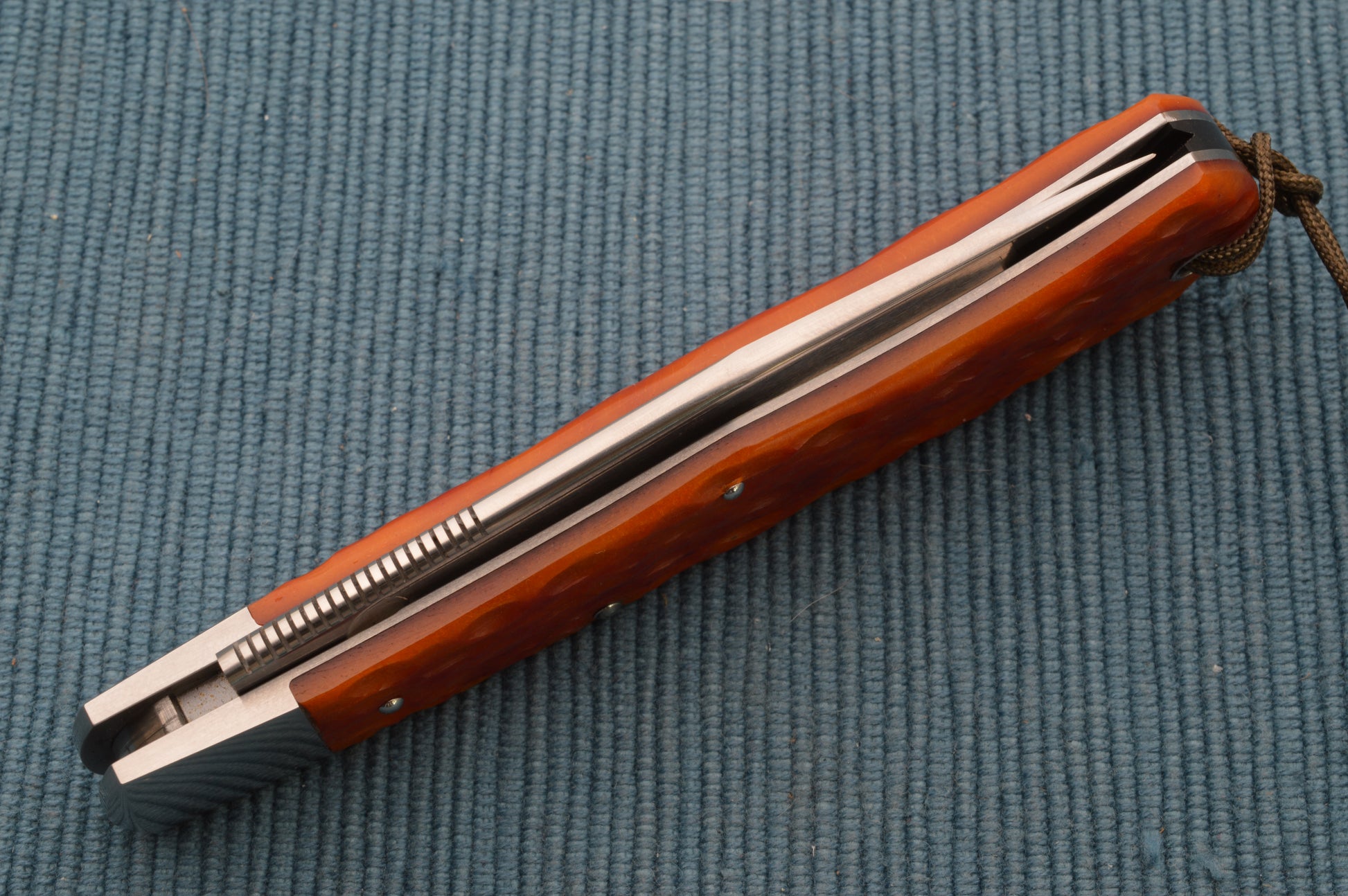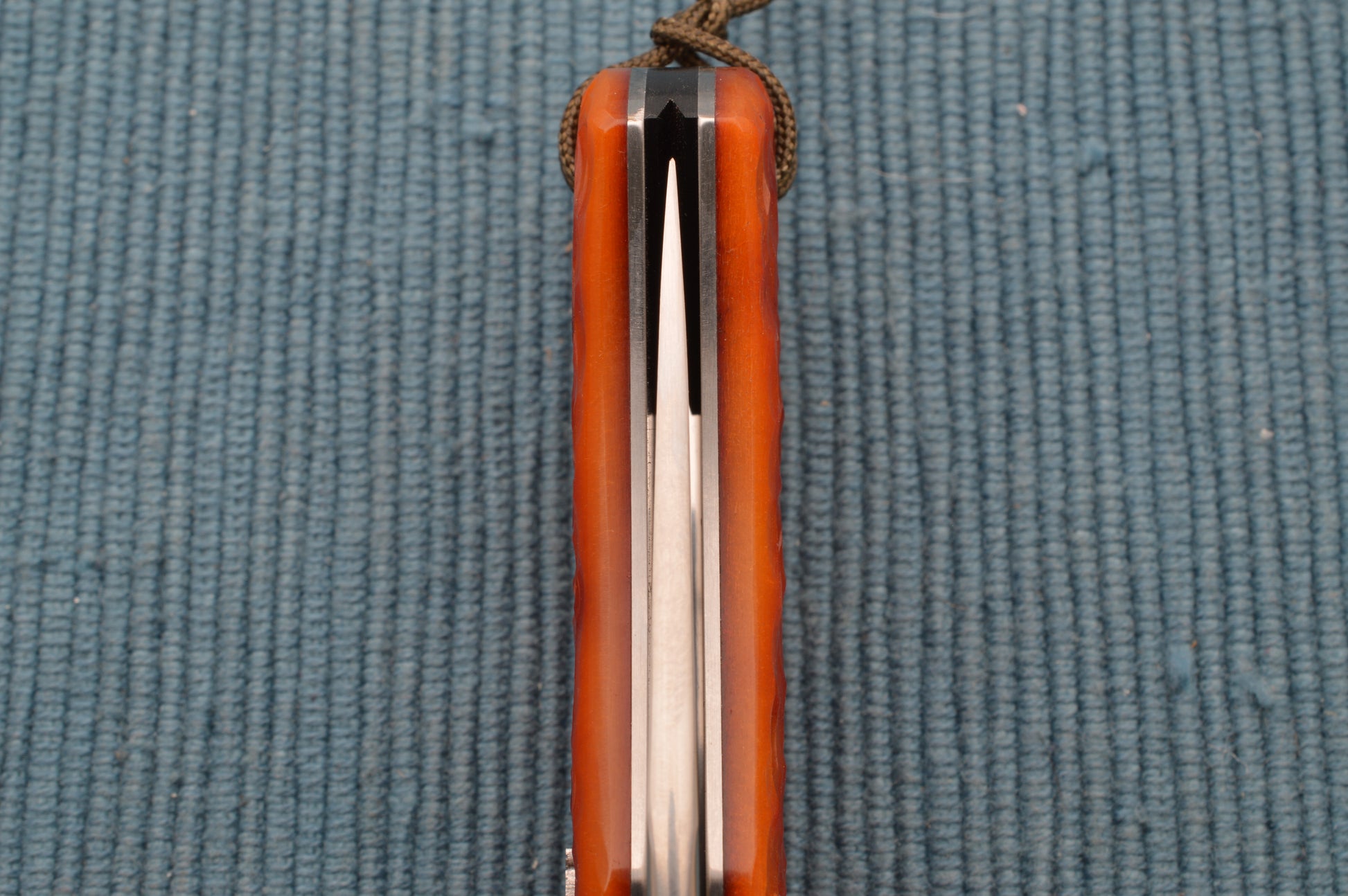 This Remington 1303 lock-back is brand new and direct from Tom. The Remington 1303 is basically a Remington 1306. What differentiates them is that the 1303 features jigged bone scales, whereas the 1306 may have any other scale material. The blade of this 1303 is CPM 154 stainless steel, with a hand rubbed finish and some textured jimping on the blade spine for better feel and control. The bolster and liners are 416 stainless steel and are of integral construction. The scales are beautiful Amber Jigged bone. There's also a lined lanyard hole. Tom's included a brown/gold lanyard cord with some matching beads. Nice comfortable nail nick, with a smooth and even pull. The blade locks up tight with no play, and the blade seating is centered. The blade pivots around Aluminum Bronze Bushings. Tom's grinds are clean and symmetrical, with tight tolerances! Comes in a padded, zippered Ploppert Custom Knives case.