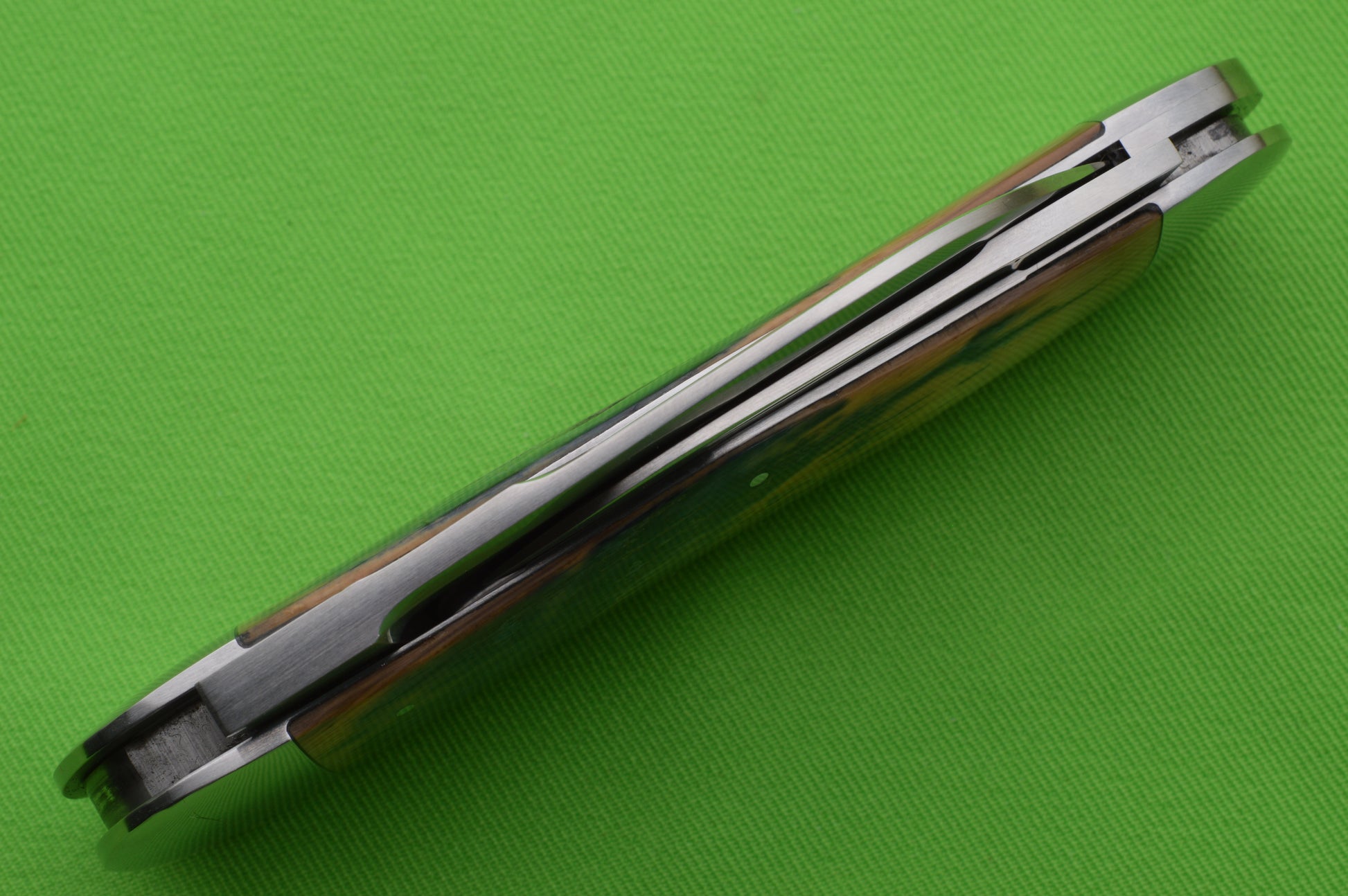 This is the Prototype of Tom Ploppert's two-blade Elephant Toenail. This pattern has also been referred to as a Rope Knife or Sunfish. This knife is NEW and was recently received, direct from Tom's shop in Alabama. The scales are premium presentation ancient, fossilized material - beautifully matched and great natural colors. Look at the size of these scales! You don't find this quality in pieces that large. Tom told me that it would be nearly impossible to find anything closely similar to these. Not to mention what they would cost. The blades, as well as the backsprings are CPM 154 stainless steel. The liners are Integral to the bolster - meaning no seams - making a knife of this construction much more challenging and time consuming to build. The liners are heat treated and tempered 416 stainless steel. The bolsters and pins are also 416 SS. Tom's "PLOPPERT" maker's mark is on the ricasso of the main blade, and "PROTOTYPE" is stamped on the reverse side of the pen blade. There is no half stop on either blade - true to the original Toenail pattern. The blades lock up tight with no play, and they are well-seated in the handle. Note that the well (inside of the handle) is narrow, so the tolerances are extremely tight. These blades sit very close to each other, as well as to the liners. They do not touch. Each should be opened and closed with care, so as not to scratch/rub the adjacent blade or liner. I have inspected both blades extensively and they came from Tom in perfect condition. The blades pivot around Aluminum Bronze Bushings. Nice deep nail nick, as well as a long pull on the main blade and a well-cut nail nick on the pen blade. Tom's grinds are clean and symmetrical. The tolerances that he is able to maintain are outstanding! Tom has truly mastered the art of slip-joint folders, and this knife is a great example. Comes in a padded zippered Ploppert case.