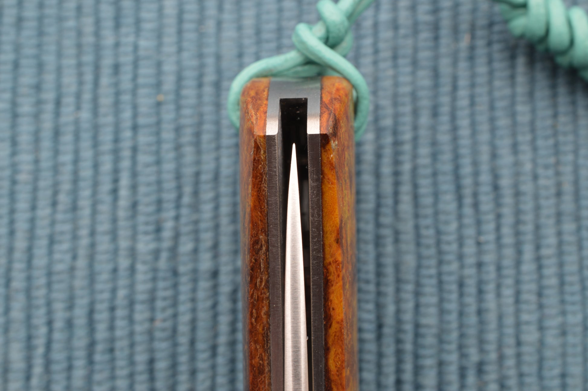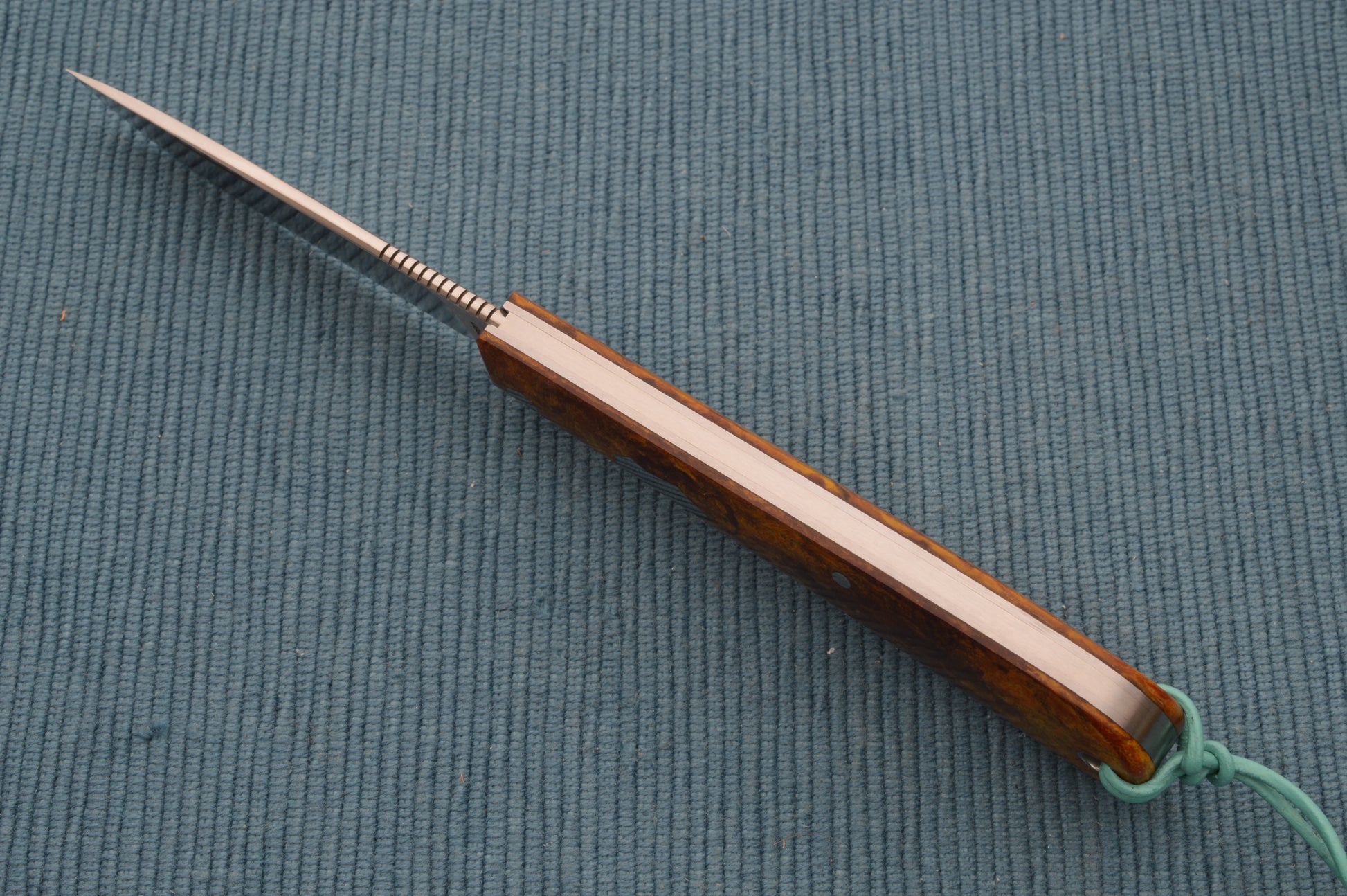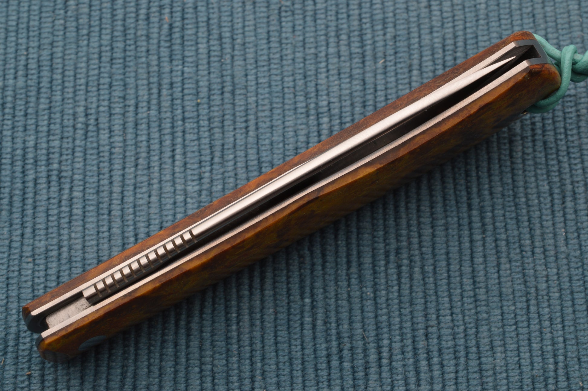 This is Tom's 80% F1 shadow pattern slip-joint folder. The only difference between the F1 and the Remington R1306 is the blade profile. The F1 has a drop point blade vs. the 1306's clip point blade. The blade on this F1 is PM 154 stainless steel, with a hand rubbed finish and some textured jimping on the radiused blade spine. The spring is also PM 154. The liner is 416 stainless steel, with milled blade relief. The scales are beautiful vintage World War II German Micarta, sometimes referred to as "Pineapple Rag". There's also a lined lanyard hole pictured with the included Little Buffalo Braiding lanyard, and a stainless steel Federal Shield. Nice comfortable nail nick, with a smooth and even pull. The blade locks up tight with no play, and the blade seating is centered. The blade pivots around an Aluminum Bronze Bushing. Has a half-stop. Tom's grinds are clean and symmetrical, with tight tolerances! Comes in a padded, zippered Ploppert Custom Knives case.